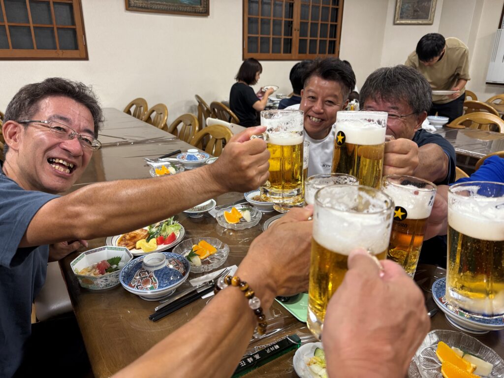 今年は新しくクラブ員でもある角谷コーチも参加して頂き、参加者も満足する合宿になったと思います。毎年恒例になりつつある生ビールを全員で堪能しました。疲れた後のビールは最高です。美味しい食事も最高でした。